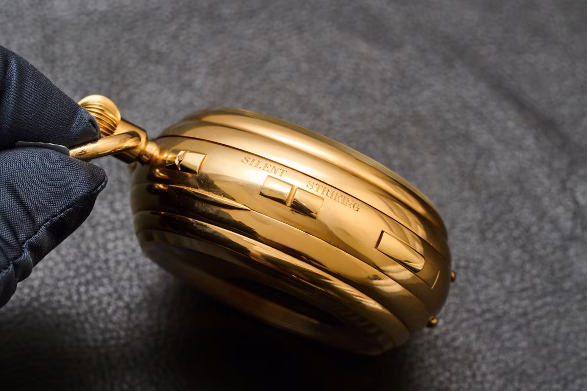 In 1921, the watch was finally delivered to S. Smith & Sons, who signed the dial, adding "Trafalgar Square." The bezel interior is hallmarked FT for Frederick Thoms, with London hallmarks. Thoms was a noted English casemaker specializing in top-tier complicated cases. The massive 18k gold case features sliders to set the striking mode from on to silent, from hours to hours and quarters, or to chime the minute repeater. The remaining protrusions on the case are switches that aid in setting the watch.