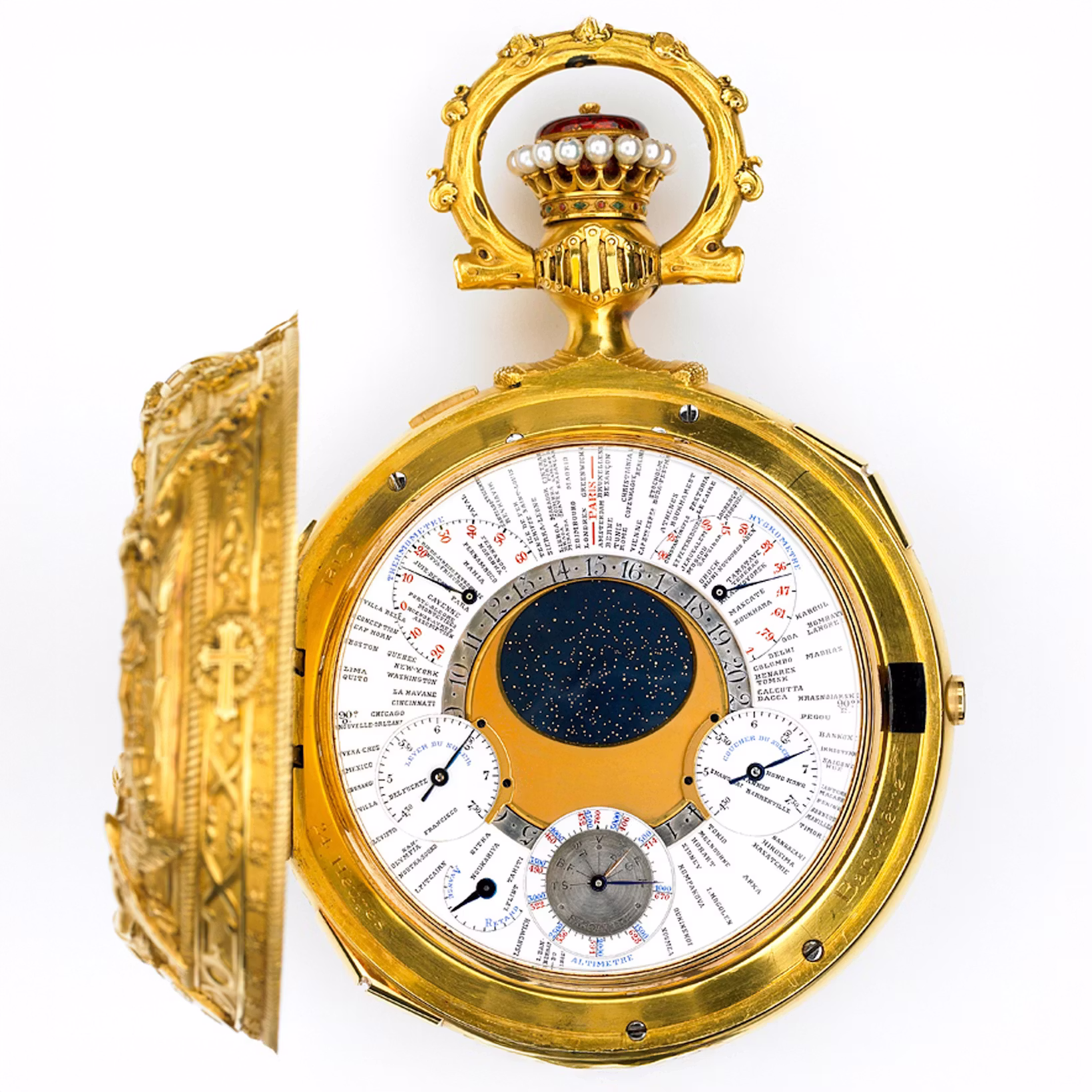 The timekeeping functions: hours and minutes of sidereal time (2), equation of time, and tourbillon regulator. The calendar functions: perpetual calendar, century leap-year correction, day of the month, days of the week, months, a star chart, age calculation, and phases of the moon. The chronograph functions: chronograph, hour recorder, and minute recorder. The chime: "Grande sonnerie" with carillon, "Petite sonnerie" with carillon, minute-repeater, and chiming mechanism with silent mode. Other functions: going train up-down (power reserve) indication)