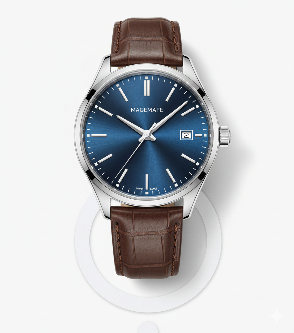 Our first-ever moonphase complication, a nod to marking time and charting change, to our journey so far and the next phase ahead. This limited edition design features a real-time moonphase display, set against a crisp midnight sky dial with luminous markers. A polished silver case adds a clean finish, paired with a deep navy Saffiano leather strap for a sharp, modern contrast.